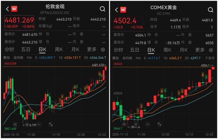 中新网12月23日电(记者 张乃月)北京时间12月23日,欧博娱乐国际金价亚洲早盘时段上涨,创下历史新高,COMEX黄金期货一度突破4500美元/盎司,现货黄金突破4480美元/盎司。