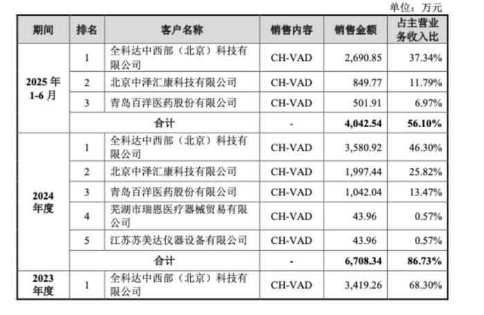 招股书显示,2022年至2024年,CH-VAD系统的主营业务收入从827.2万元增长至6705.98万元。2025年上半年,CH-VAD系统和BrioVAD系统(两者血泵相同)的主营业务收入分别为4021.29万元和2961.16万元,合计占整体营收的96.9%。