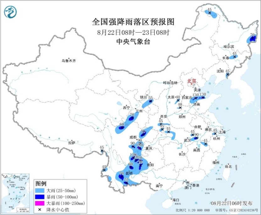 中央气象台今日10时继续发布暴雨蓝色预警,预计8月22日14时至23日14时,四川盆地中西部和南部、贵州西南部、湖北西北部和东北部、云南中北部、甘肃南部和东部、宁夏中南部、陕西南部、山西中南部、河北西南部、山东北部、内蒙古东北部、黑龙江北部、吉林东部、辽宁东部等地部分地区有大到暴雨,其中,四川盆地南部、云南东北部等地局地有大暴雨。上述部分地区伴有短时强降水(最大小时降雨量20~50毫米,欧博allbet局地可超过70毫米),局地有雷暴大风等强对流天气。
