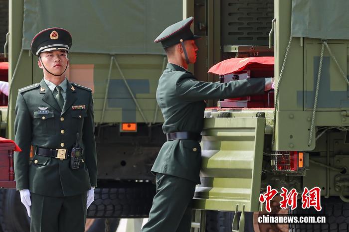 在沈阳初秋的风里,英雄们回到祖国的怀抱。迎回仪式现场庄严肃穆,志愿军烈士遗骸棺椁覆盖着鲜艳的五星红旗,到场迎接的解放军官兵军容威严、持枪鹄立,现场全体人员向烈士遗骸行三鞠躬礼,以此表达对先烈们的深切缅怀和无尽哀思。