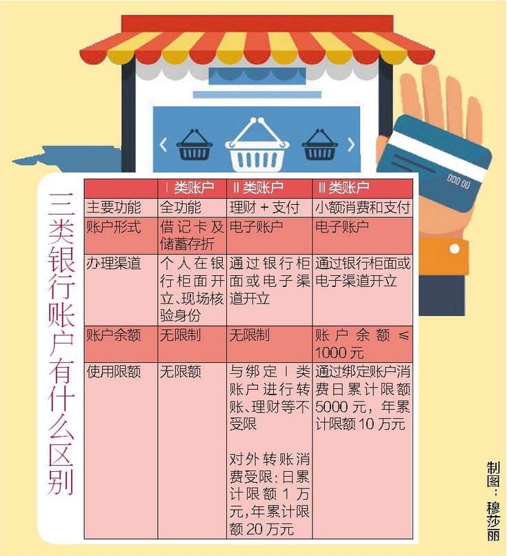 所谓I类账户是全功能大额账户,可以办理存款、转账、消费缴费、购买投资理财产品等,使用范围与金额不受限制;II类账户可以办理存款、购买投资理财产品及限定金额的消费等。Ⅱ类账户资金转入转出日限额均为1万元、年限额均为20万元;III类账户主要用于网络支付,只能进行小额消费和缴费支付。Ⅲ类户转入转出日限额则分别为5000元和10万元,余额不得超过1000元。