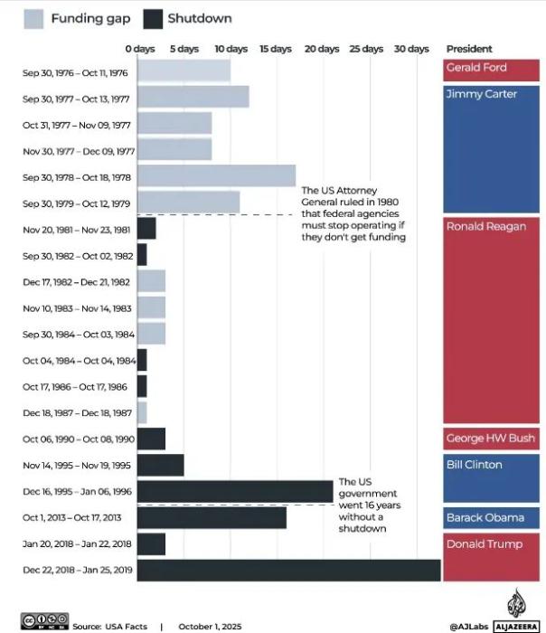 回顾历史,美国联邦政府“停摆”并非罕见现象。卡塔尔半岛电视台指出,自1976年现行联邦预算程序建立以来,华盛顿已经历了20次资金缺口,其中导致了10次正式的政府“停摆”。