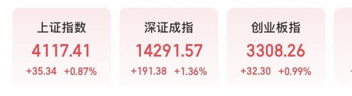 截至收盘,沪指涨0.87%报4117.41点;深成指涨1.36%报14291.57点;创业板指涨0.99%报3308.26点。