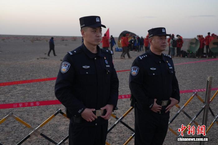 13时许,内蒙古边检总站阿拉善边境管理支队民警已在着陆场外围布防完毕,巡逻车发动机轰鸣声在空旷的戈壁上回荡。