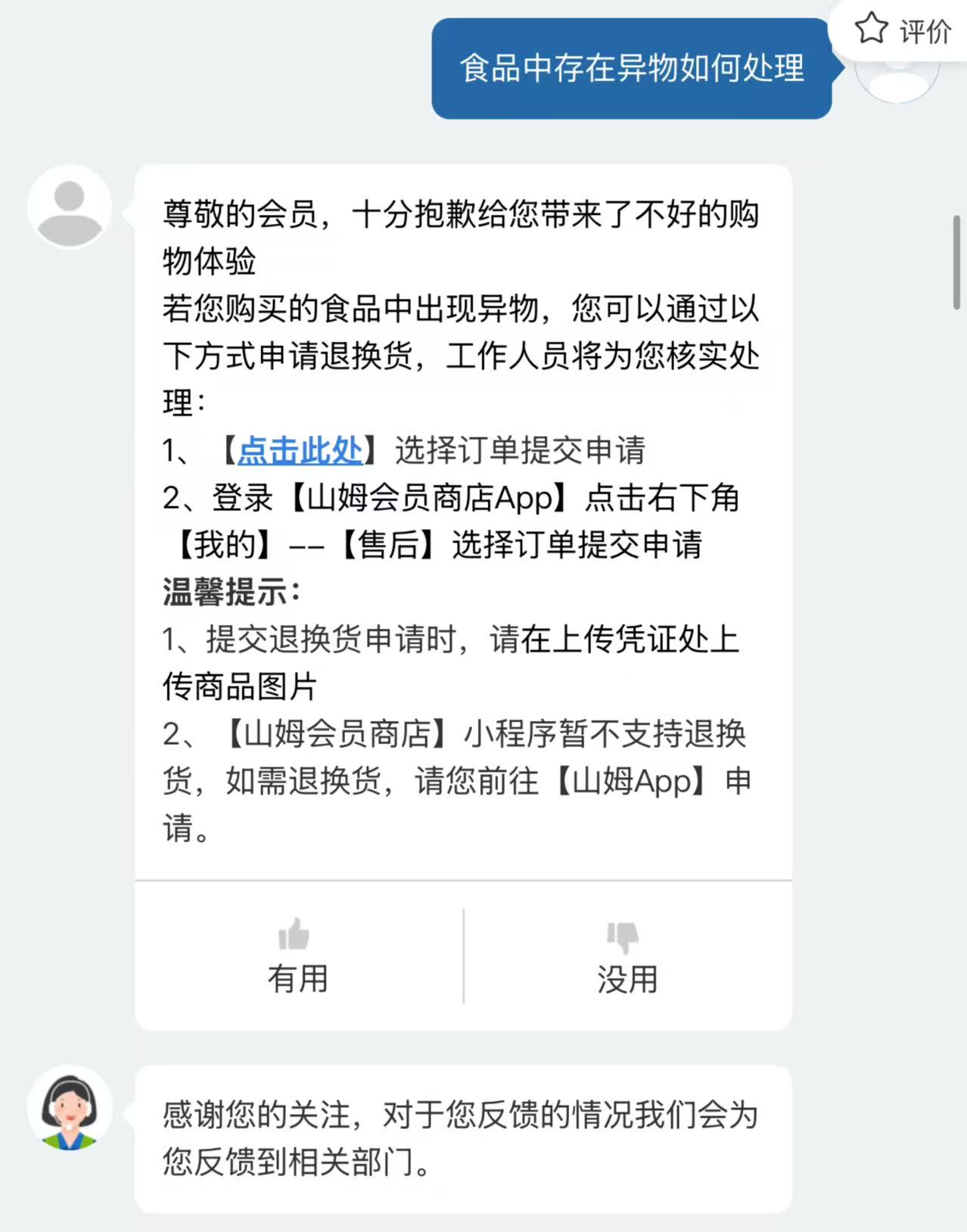 此外,山姆会员商店APP机器人客服提供的信息显示,若购买的食品中出现异物,可以在山姆会员商店APP中申请退换货,工作人员将核实处理。(完)
