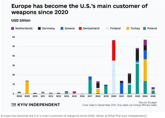 《基辅独立报》报告显示,2022至2024年,欧洲北约成员国装备支出的51%流向了美国军火商,例如F-35战斗机、“爱国者”导弹防御系统……高于2019年至2021年的28%,对美军事依赖绝非朝夕可破。