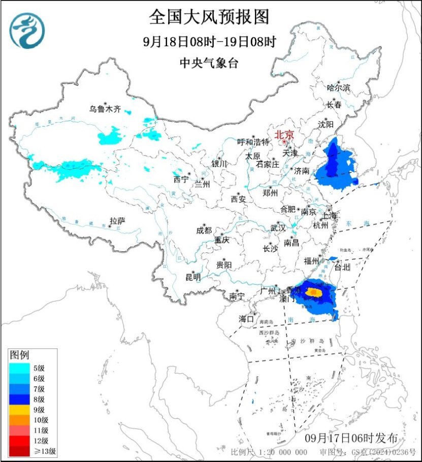 受冷空气和热带系统影响,未来两天渤海、黄海、南海东北部有大风。中央气象台今晨继续发布大风蓝色预警:预计9月17日,渤海、渤海海峡、黄海大部海域将有7~8级、阵风9级的大风,其中黄海中西部的部分海域风力可达9级、阵风10~11级,南海东北部部分海域、巴士海峡将有7~8级、阵风9级的大风。9月18日,黄海大部海域、台湾海峡南部将有7~8级、阵风9级的大风,南海东北部海域将有9~10级、阵风11~12级的大风。上述地区涉海旅游、工作及作业平台、来往船只需做好安全管理工作,公众避免前往危险区域。
