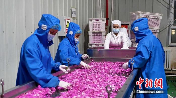 这种全产业链发展模式,创造了4000多个就业岗位。加依乡村民托胡提汗·如孜在生产线熟练操作多个岗位,月工资3500元,闲时还能照看自家玫瑰田。电商直播更让产品销往15个国家,2024年线上销售额同比增长40%。