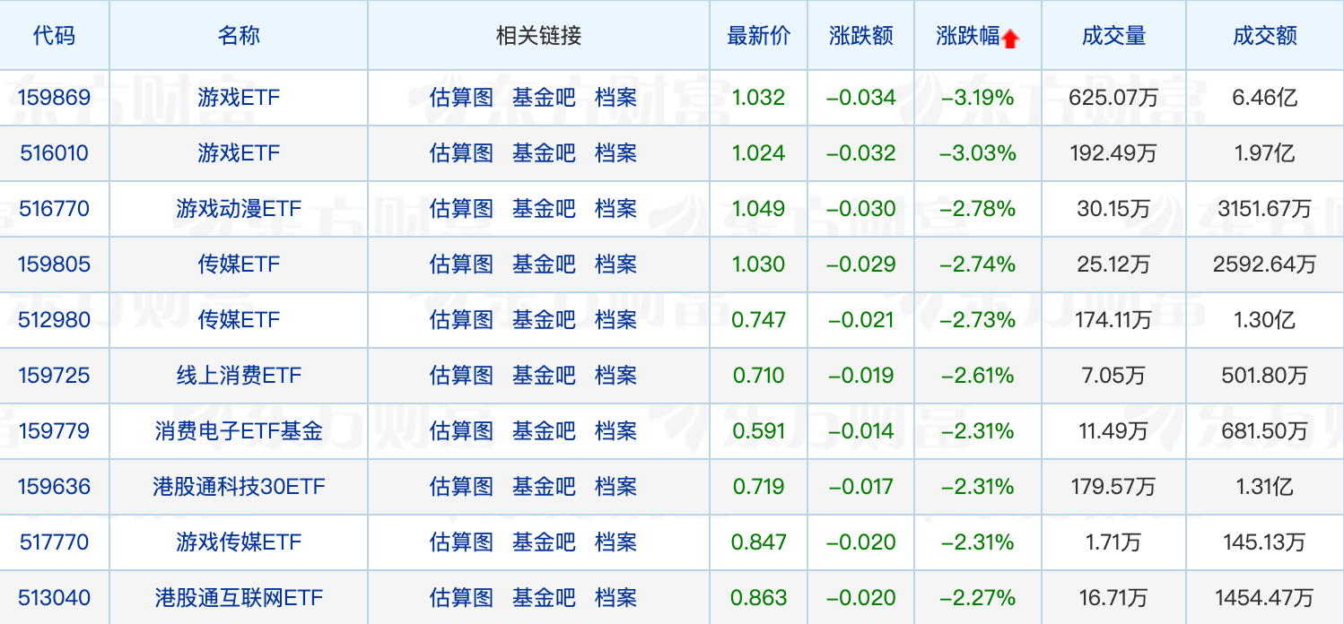 下跌方面,游戏板块领跌,惠程科技、凯撒文化跌超6%,带动游戏ETF下探,最高下跌3.19%。