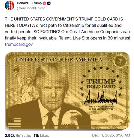 根据特朗普的声明,美政府正式接受“黄金卡”签证计划申请。所谓“黄金卡”计划,旨在通过收取高昂费用,鼓励全球富人移居美国并获得居留许可。