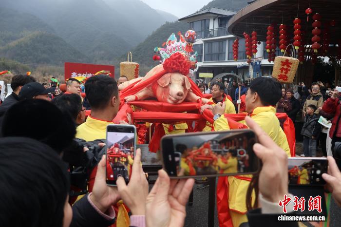 2月7日早上,雪后细雨与炊烟氤氲笼罩着杭州市富阳区湖源乡新一村。壶源溪畔,红绸装饰的年猪被八名大汉扛起,开启巡游仪式。