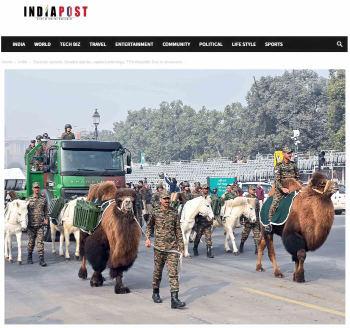 据《新印度快报》报道,参加今年“共和国日”阅兵的动物,主要来自印度陆军后勤兽医部队,包括2头双峰骆驼、4匹赞斯卡矮种马、4只猛禽及10只印度本土犬种。
