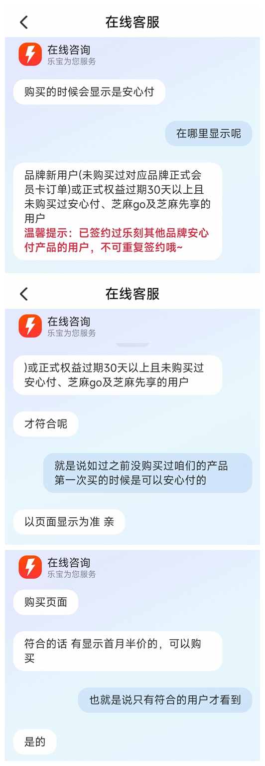 针对“安心付”退费规则是否明确告知的问题,记者询问了乐刻客服,对方表示,只有品牌新用户等符合相关条件的人才能开通,以页面显示为准。