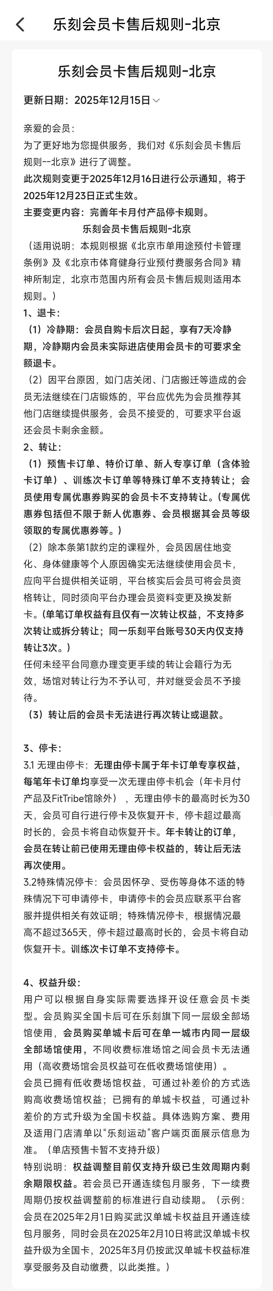 四则条款协议中,只有《自动续费协议》中明确提到了有关退费的限制,“如在服务期限内,会员依照《乐刻服务协议》停卡或退卡的,依照乐刻服务协议相关约定处理”。但记者阅读《乐刻服务协议》后,同样未发现明确说明“退卡”内容的相关条款。