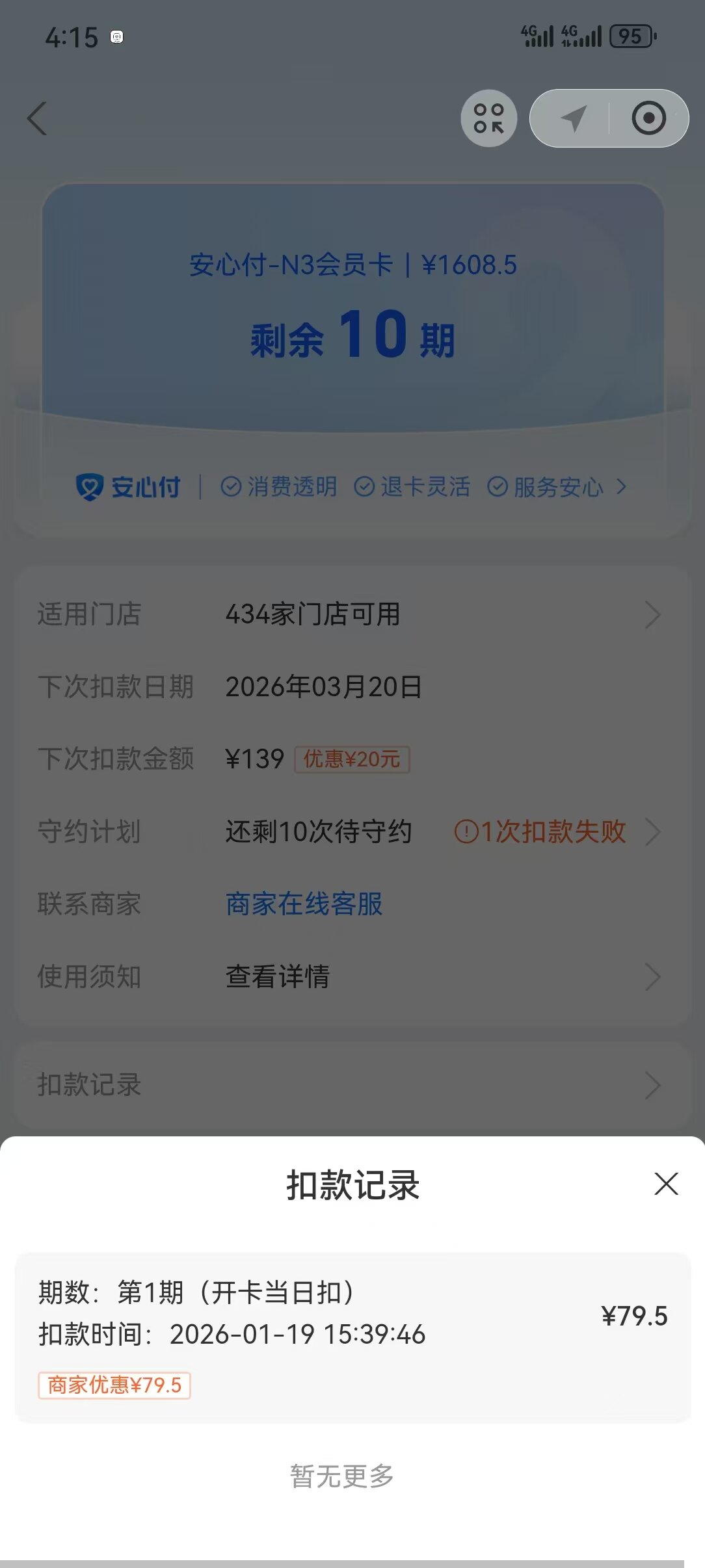 据施瑾瑜讲述,由于没有在对应支付平台内存钱的习惯,健身房在第二个月没有自动扣款成功。“但前不久我用它转钱,导致乐刻完成扣费139元(阶梯价次月月费优惠价格),我申请退款时,又被扣了79.5元。”