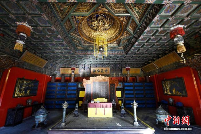 养心殿正殿明间依照雍正以来举行小朝会时的样貌布置,宝座上方悬挂雍正御笔“中正仁和”匾。