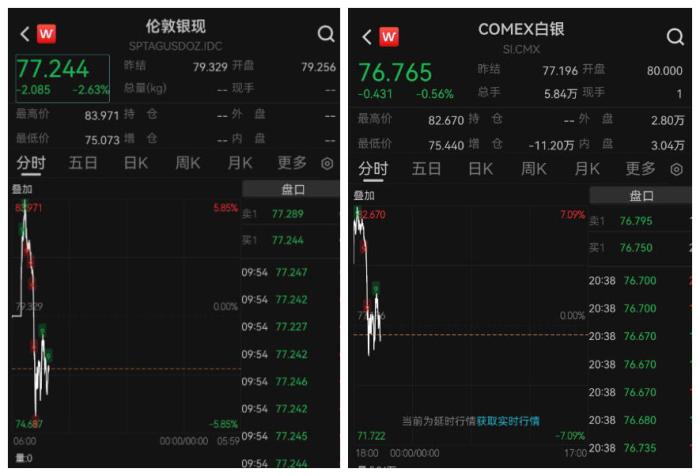 具体来看,伦敦白银现货一度涨超5%,但随后转跌,跌幅一度超5%;COMEX白银期货一度涨超7%,随后同样转跌。黄金期货、现货均由涨转跌。