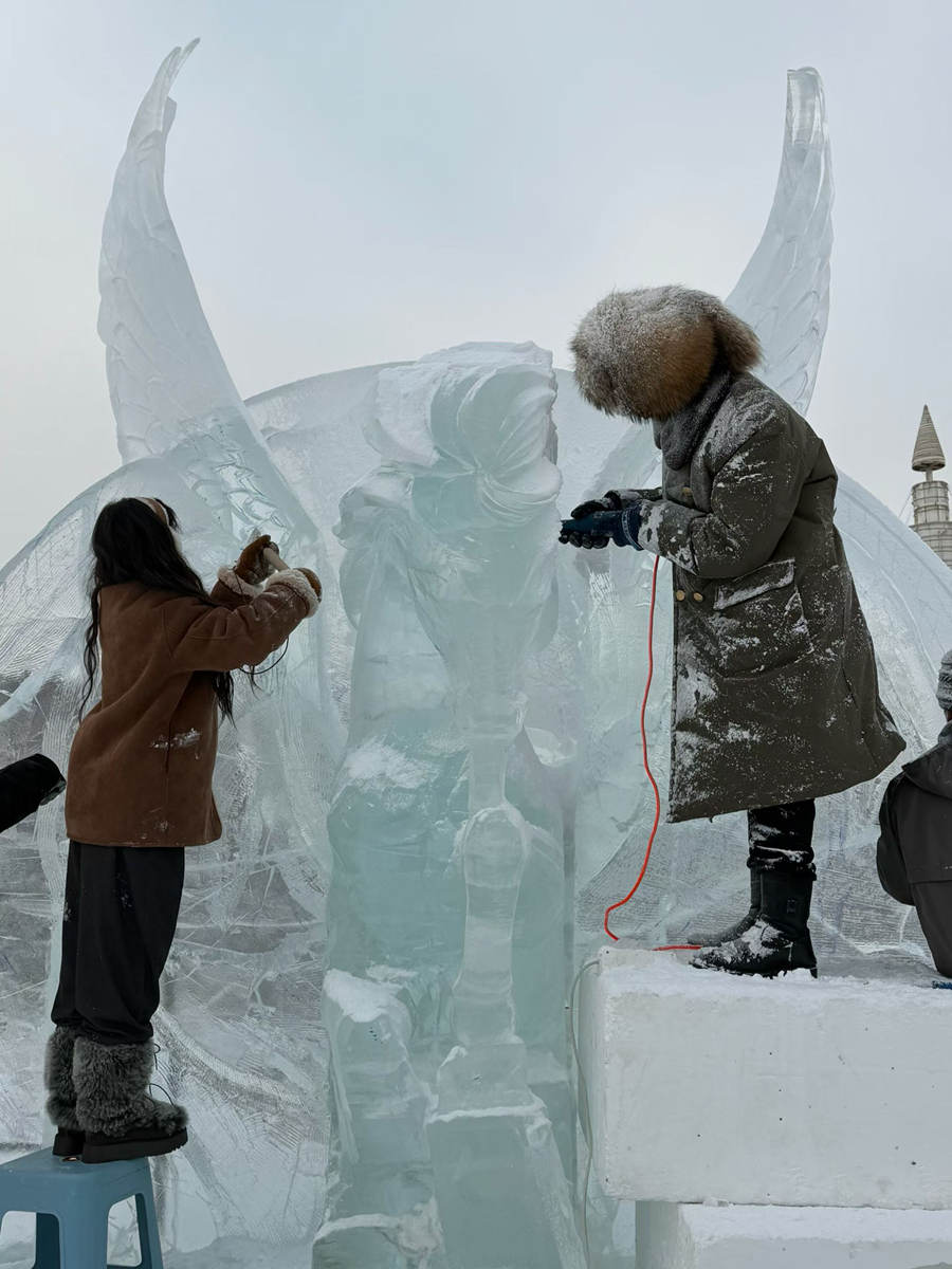 “师傅,你雕了多久啊?”“头上那个装饰是怎么弄的?”总有好奇的游客围在他们身前提问。认真雕琢的冰雪雕刻师们,也成了景区里一道别样的风景。