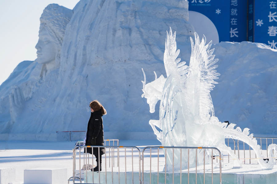 2月中旬的长春冰雪新天地,一座冰雕前总是围满了人。