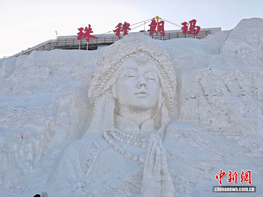 如果说祝英台是精巧婉约,那雪山女神就是恢弘大气。于佳介绍,整座雪雕由数十人团队耗时9天完成。不同于冰雕的制作工序,大型雪雕需要先将图纸等比例放大,再从雪坯上方一点点雕琢,平均每天下切两到三米,最后的四米一次成型。