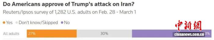其他媒体的结果也是如此。路透社/益普索发布的一项民调显示,仅有约27%的美国人支持特朗普政府日前对伊朗发起的打击行动,而有56%的人认为特朗普使用的武力手段“太过了”。