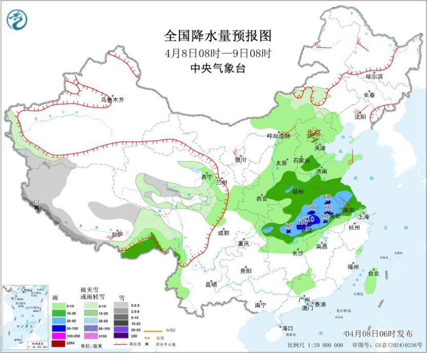 人民网北京4月8日电 (记者温璐、高清扬)据中央气象台网站消息,预计4月8日至4月10日,江汉、江淮、江南北部及重庆等地的部分地区有中到大雨,局地暴雨或大暴雨,并伴有短时强降水、雷暴大风或冰雹等强对流天气。中央气象台今晨同时发布了暴雨蓝色预警和强对流天气蓝色预警。