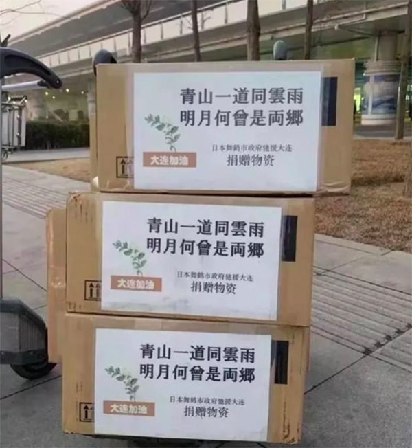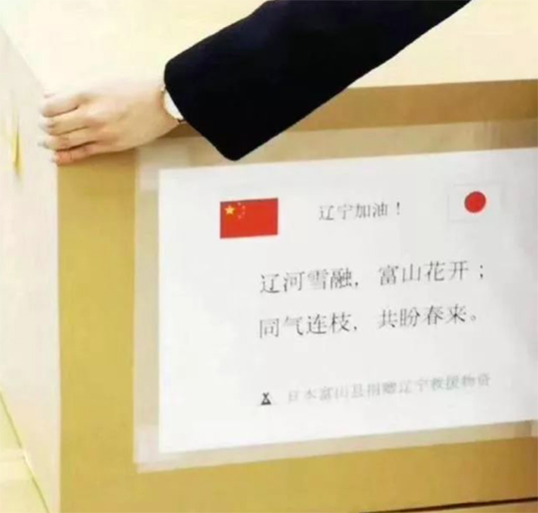 最近,亚星日本送来的抗疫物资上频频引经据典——有取自日本国长屋王偈子的“山川异域,风月同天”,有取自《诗经·秦风·无衣》的“岂曰无衣,与子同裳”,最近的一批物资上的文字则引用了唐代诗人王昌龄《送柴侍御》中的一句“青山一道同雲雨,明月何曾是两鄕”,甚至还化用《千字文》中的“同气连枝”写作了一首小诗——“辽河雪融,富山花开;同气连枝,共盼春来。”