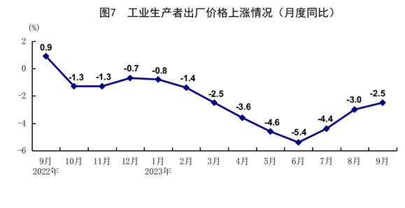 前三季度,全国工业生产者出厂价格同比下降3.1%。其中,9月份同比下降2.5%,降幅比上月收窄0.5个百分点,环比上涨0.4%。前三季度,工业生产者购进价格同比下降3.6%。其中,9月份同比下降3.6%,降幅比上月收窄1.0个百分点,环比上涨0.6%。