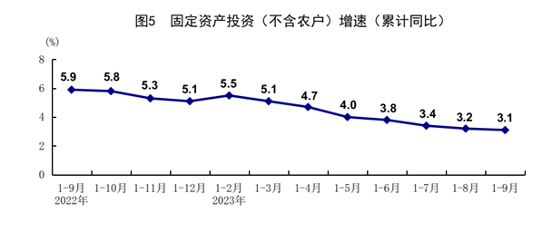 前三季度,全国固定资产投资(不含农户)375035亿元,同比增长3.1%;扣除价格因素影响,同比增长6.0%。分领域看,基础设施投资同比增长6.2%,制造业投资增长6.2%,房地产开发投资下降9.1%。全国商品房销售面积84806万平方米,同比下降7.5%;商品房销售额89070亿元,下降4.6%。分产业看,第一产业投资同比下降1.0%,第二产业投资增长9.0%,第三产业投资增长0.7%。民间投资下降0.6%;扣除房地产开发投资,民间投资同比增长9.1%。高技术产业投资同比增长11.4%,其中高技术制造业和高技术服务业投资分别增长11.3%、11.8%。高技术制造业中,航空、航天器及设备制造业,医疗仪器设备及仪器仪表制造业投资分别增长20.7%、17.0%;高技术服务业中,科技成果转化服务业、专业技术服务业投资分别增长38.8%、29.6%。9月份,固定资产投资(不含农户)环比增长0.15%。