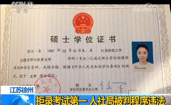 央视网消息:去年6月,江苏省徐州市事业单位的公开招聘中,以专业不符的理由拒绝录用一位在招聘考试中笔试、面试都成绩第一的女硕士,该事件随后引发广泛关注,考生家属将徐州市人社局告上了法庭。23号,徐州市铁路运输法院对此案做出了一审公开宣判,认定原告不符合招录条件,徐州市人社局做出的取消聘用资格的行为,在实体上并无不当,但在操作程序上违法。