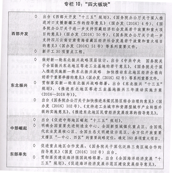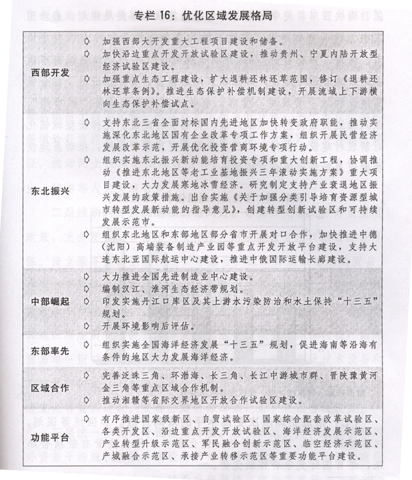 二是优化区域发展格局。全面实施西部大开发“十三五”规划,加强基础设施薄弱环节建设和生态环境保护,加快特色优势产业转型升级发展。全面实施新一轮东北地区等老工业基地振兴重大政策和重点任务,推动实施东北振兴“十三五”规划,组织东北地区和东部地区部分省市开展对口合作,加大对城区老工业区、独立工矿区改造和采煤沉陷区综合治理支持力度。全面实施促进中部地区崛起“十三五”规划,支持汉江、淮河生态经济带加快发展,办好山西可持续发展综改试验区。支持东部地区加快率先转型发展,进一步发挥改革创新示范引领作用。统筹加强国内国际区域合作,支持重要功能平台建设。大力推进陆海统筹发展。加快推进革命老区、民族地区、边疆地区和集中连片特困地区基础设施和公共服务设施建设,推动融入国家重大发展战略。加大中央支持和对口支援力度,继续支持新疆、西藏和四省藏区发展。