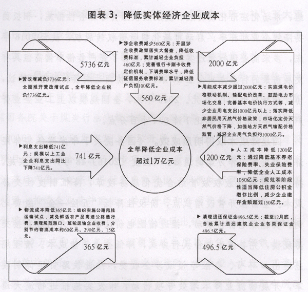 四是降成本取得明显成效。《国务院关于印发降低实体经济企业成本工作方案的通知》(国发〔2016〕48号)印发实施。持续推进简政放权放管结合优化服务改革,降低制度性交易成本。全面推开营改增试点,阶段性降低“五险一金”缴费比例。实施煤电价格联动,推进输配电价改革,扩大电力直接交易规模,完善基本电价执行方式,降低企业用能成本。清理规范进出口环节、金融等领域涉企收费,推进铁路货运体制改革,开展物流业降本增效专项行动,印发实施推进物流大通道建设行动计划。2016年,规模以上工业企业每百元主营业务收入中的成本同比降低0.1元,利润率同比提高0.19个百分点。