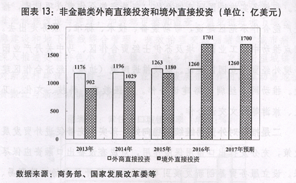 四是引导对外投资健康有序发展。加强对外投资活动的真实性审查,建立不良记录名单制度,实施国有企业对外投资资本金制度,防范对外投资过快增长风险。健全对外投资促进政策和服务体系,引导企业有序合规走出去。2017年非金融类境外直接投资预期与2016年基本持平。