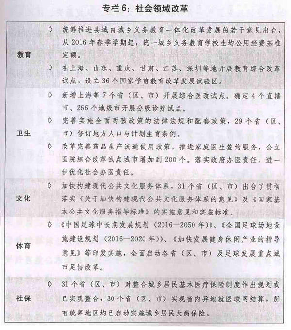 七是社会领域改革加快推进。中央和国家机关公务用车制度改革全面完成,地方党政机关公车改革深入推进。行业协会商会与行政机关脱钩改革第二批试点启动实施。加快不动产统一登记制度落地,全国100%的地(市、州)、98%的县(市、区)实现“发新停旧”。国家科技计划管理改革继续深化,以增加知识价值为导向的分配政策出台,科技成果转化力度加大。教育领域综合改革向纵深推进。分级诊疗制度建设持续推进,城乡居民基本医疗保险制度整合取得实质性进展,个人卫生支出占卫生总费用的比重下降到28.9%。《国务院办公厅关于全面放开养老服务市场提升养老服务质量的若干意见》(国办发〔2016〕91号)印发实施。稳步推进机关事业单位养老保险制度改革。加快构建中国特色哲学社会科学,实施哲学社会科学创新工程。足球改革加快推进。