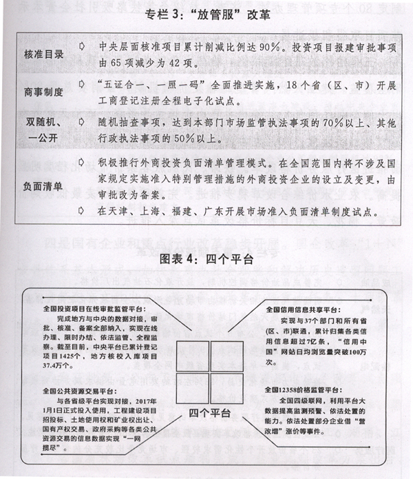 一是简政放权放管结合优化服务改革向纵深推进。在提前完成本届政府减少行政审批事项三分之一目标的基础上,去年又取消165项国务院部门及其指定地方实施的审批事项,清理规范192项审批中介服务事项、220项职业资格许可认定事项。第三次修订政府核准的投资项目目录。商事制度改革继续深化。全面推行“双随机、一公开”,增强事中事后监管的有效性,推进“互联网+政务服务”。市场准入负面清单制度改革试点开局良好。“放管服”四大平台建成运行。