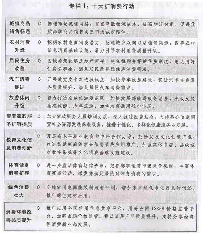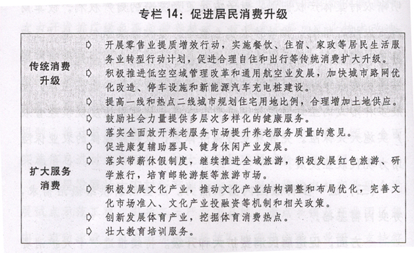 一方面,促进居民消费扩大和升级。持续推进“十大扩消费行动”,顺应消费需求变化新趋势,以改革创新增加消费领域特别是服务消费和绿色消费有效供给,保持消费平稳增长。2017年社会消费品零售总额预期增长10%左右。放宽服务业准入限制和社会领域投资管理。积极发展医养结合、文化创意、全域旅游等新兴消费,支持社会力量提供教育、文化、养老、医疗等服务。促进数字家庭、在线教育、虚拟现实等信息消费。开展加快内贸流通创新推动供给侧结构性改革扩大消费专项行动,推动实体店销售和网购融合发展。保护和传承中华老字号。扩大内外销产品“同线同标同质”实施范围。大力发展冷链物流。建立健全食品药品等的质量安全标准和追溯体系。加大价格监管和反垄断执法力度,保护消费者合法权益。强化收入分配改革激励导向,实施重点群体激励计划,开展城乡居民增收综合配套政策试点。