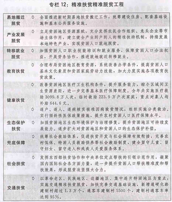 五是补短板力度加大。坚持既利当前又利长远,既重硬设施又重软能力,以市场化投融资方式带动银行贷款等资金投放,在脱贫攻坚、灾后水利恢复重建、社会事业、创新能力、新产业等关键领域和薄弱环节,抓好补短板建设。全年完成1000万以上农村贫困人口脱贫目标任务。