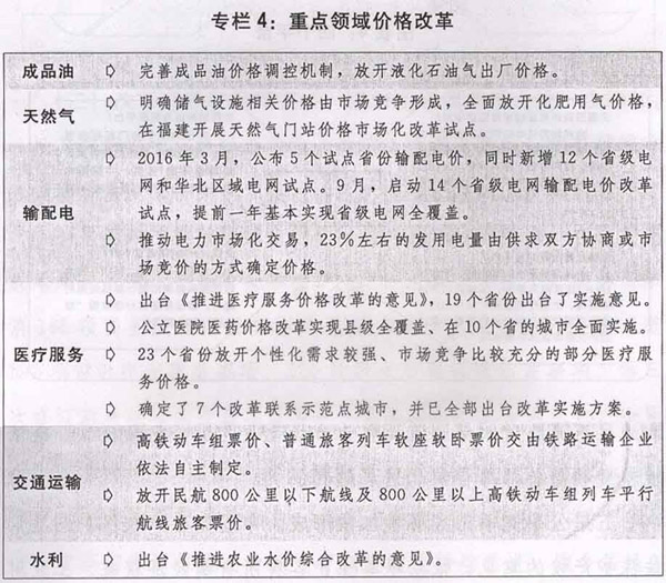 三是价格改革继续深化。输配电价改革试点实现所有省级电网全覆盖。建立天然气管道运输定价新机制,占消费总量80%以上的非居民用气门站价格主要由市场主导形成。石油天然气交易市场加快发展。90%左右的城市已推广居民阶梯水电气价。全面推进医疗服务价格改革。铁路、民航旅客票价市场化程度明显提高。农业水价综合改革稳步推进。完善稻谷和小麦最低收购价政策,棉花、大豆目标价格改革试点深入推进。