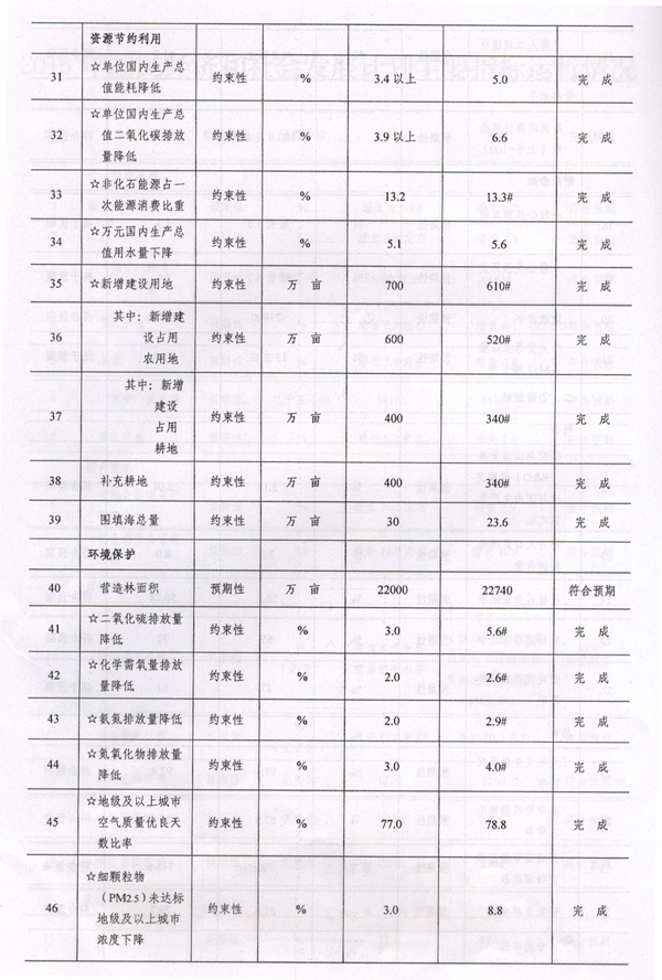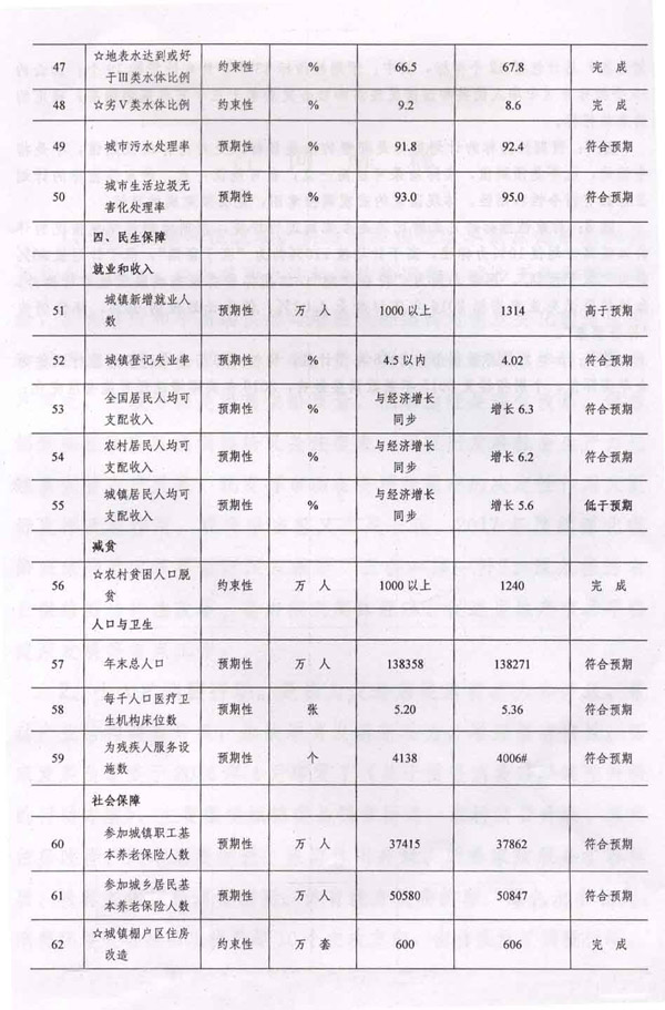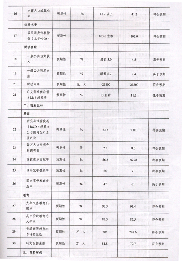 注3:约束性指标的完成情况用是否完成进行评价;预期性指标完成情况的评价以偏离计划值10%为标准,高于计划值110%的为“高于预期”,低于计划值90%的为“低于预期”,两者之间为“符合预期”;但指标带有限高或限低性质的除外,如城镇登记失业率指标2016年实际数为4.02%,低于计划值的90%,评价仍为“符合预期”。