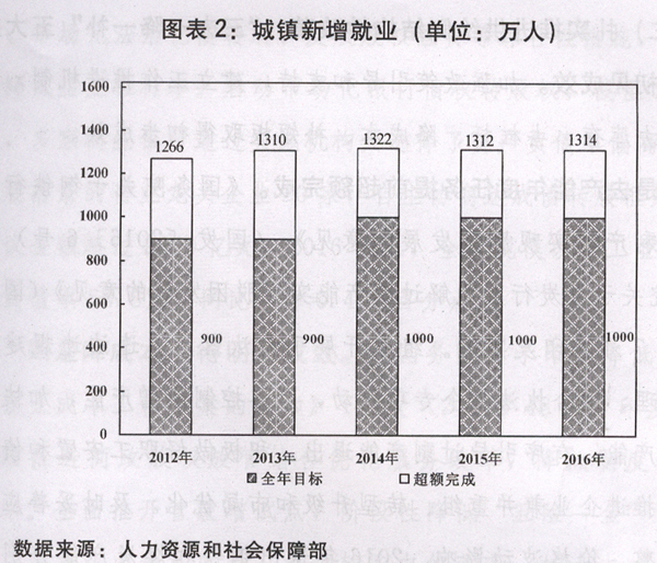 ——就业形势保持总体稳定。城镇新增就业1100万人以上,比2016年预期目标多100万人,城镇登记失业率控制在4.5%以内。主要考虑:一是就业压力较大。预计2017年仍有1500万左右新成长劳动力进入市场,加上去产能行业职工转岗需求有所增加,考虑退休等腾退的城镇就业岗位,需要新增约1100万人的城镇就业。二是就业容量不断扩大。随着产业结构调整,特别是创新创业和服务业发展,就业弹性系数明显提高,6.5%左右的经济增长,可以实现就业目标,实际完成数量还可以力争更多一些。三是实现城乡居民收入增长与经济增长基本同步的需要。体现了党和政府以人民为中心的发展思想和民生为先、就业为本的执政理念,有利于稳定预期和增强发展信心。