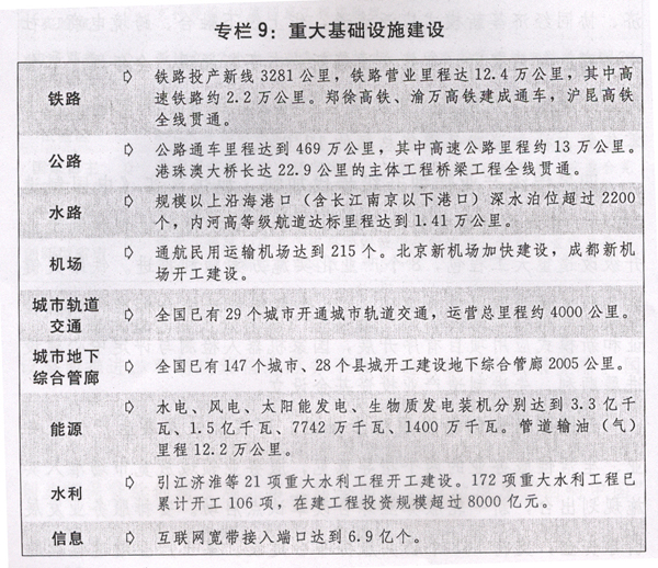 六是基础设施网络进一步完善。加快推进现代综合交通运输体系建设,交通基础设施网络总里程突破500万公里。交通提质增效、扶贫脱贫、重大基础设施建设“一二三百”工程出台实施,推进多式联运发展,促进通用航空业发展,推动交通物流融合发展。能源生产和消费革命战略出台,能源供应能力不断增强,非化石能源消费比重预计上升到13.3%,煤炭消费比重下降到62.0%。全国地级市基本建成光网城市,新一代信息基础设施更加完善,建成全球最大的4G网络。