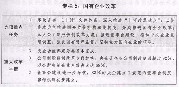 四是国有企业和重点行业改革稳步开展。国企改革“1+N”文件体系基本形成,加快剥离办社会职能和解决历史遗留问题工作方案等配套文件出台,深化国企改革九项重点任务、十项改革试点扎实推进。第一批混合所有制改革试点进入实施阶段。第一批国有资本投资公司试点取得阶段性进展。31个省(区、市)电改方案获批复,公布了首批105个增量配电业务改革试点项目。各省(区、市)国有林场改革实施方案和内蒙古、吉林、黑龙江重点国有林区改革实施方案均已制定完成,浙江、湖南、江西等6省国有林场改革试点顺利完成。盐业体制改革方案出台,全面放开食盐出厂、批发和零售价格。改革玉米收储制度,将东北地区玉米临时收储政策调整为市场化收购加补贴新机制。政策性粮食和储备棉库存消化进展顺利。