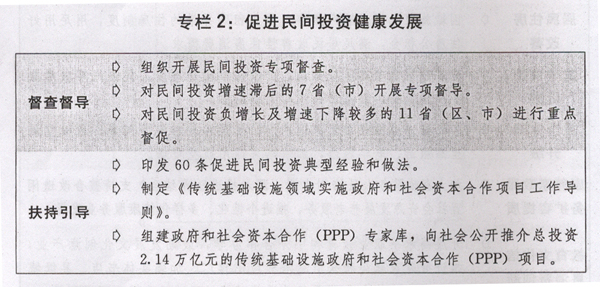 二是投资保持稳定增长。围绕补短板、调结构、增供给,努力扩大合理有效投资。中央预算内投资结构继续优化,政府投资项目储备库和三年滚动投资计划初步形成,重大工程建设加快推进。着力调动民间投资积极性,制定促进民间投资“26条”政策,加大政府和社会资本合作(PPP)模式推广力度。全社会固定资产投资增长7.9%,民间投资占固定资产投资(不含农户)比重为61.2%。