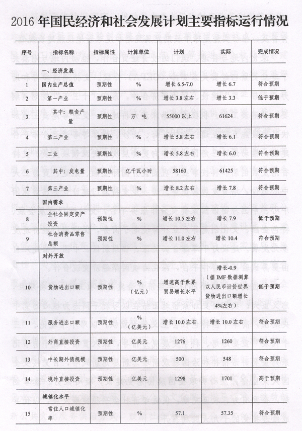 一、2016年国民经济和社会发展计划执行情况
