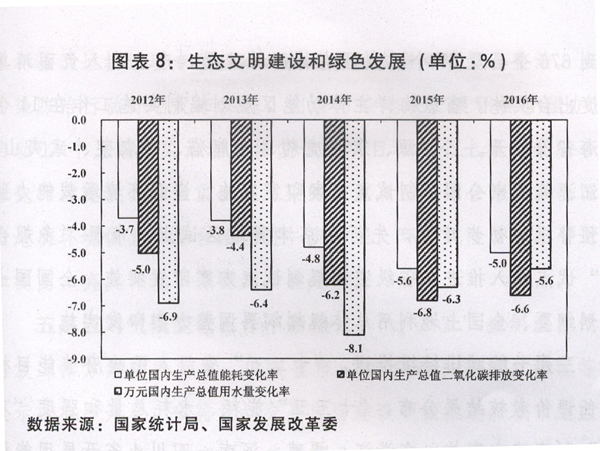 (七)加强生态环境保护和能源资源节约,绿色发展初见成效。单位国内生产总值能耗和二氧化碳排放量分别下降5%和6.6%,超额完成全年目标,化学需氧量、氨氮、二氧化硫、氮氧化物排放量预计分别下降2.6%、2.9%、5.6%、4.0%,地级及以上城市空气质量优良天数比例同比提高2.1个百分点,74个重点城市细颗粒物(PM2.5)年均浓度下降9.1%,地表水达到或好于Ⅲ类水体比例同比提高1.8个百分点、劣Ⅴ类水体比例同比下降1.1个百分点,万元国内生产总值用水量下降5.6%。