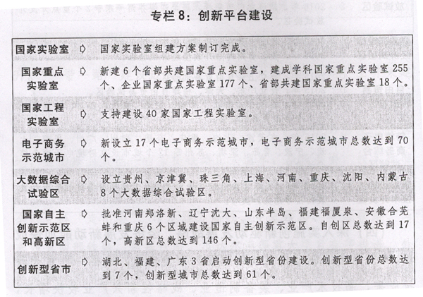 一是加快培育壮大经济发展新动能。推动8个区域全面创新改革试验取得决定性进展,出台培育壮大新动能、互联网市场准入等政策文件。支持和引导分享经济发展,提高社会资源利用效率。建立国家科技决策咨询制度,改革科技评价制度,统筹推进中央财政科技计划和资金管理改革,开展以知识价值为导向的分配政策试点。加大对信息、民用空间、重大科技基础设施建设投入,支持北京怀柔、上海张江、安徽合肥综合性国家科学中心建设,建成一批产业创新中心,构建全国一体化的国家大数据中心体系。继续布局建设国家自主创新示范区。深入推进协同创新。扩大区域性成果转移转化试点示范,创建国家可持续发展议程创新示范区。继续实施国家科技重大专项,启动实施科技创新2030—重大项目。在重大创新领域启动组建国家实验室,建设一批国家技术创新中心。支持北京、上海建设科技创新中心。新建一批双创示范基地和专业化众创空间。实施院所、企业和社团三大创新创业活动,围绕创新创业平台市场化运行、创业人才培养等瓶颈制约,出台一批硬措施。发挥好创业投资引导基金作用,促进创业投资持续健康发展。打造全国双创活动周和“创响中国”品牌,持续营造良好氛围。