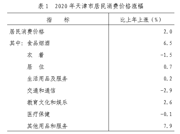 居民消费价格涨幅回落。全年居民消费价格上涨2.0%,涨幅比上年回落0.7个百分点。分类别看,食品烟酒价格上涨6.5%,衣着下降1.5%,居住上涨0.7%,生活用品及服务上涨0.2%,交通和通信下降2.9%,教育文化和娱乐上涨2.6%,医疗保健下降0.1%,其他用品和服务上涨7.9%。