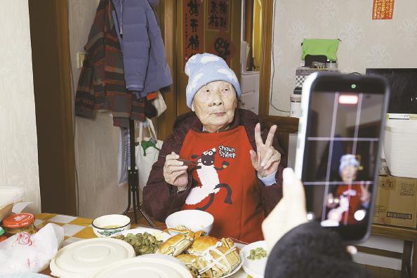 “文毓小姐,看镜头,和大家打个招呼。”昨天傍晚,钟文毓正在直播补光灯下享用晚餐——她最爱的大闸蟹。此刻拿着手机拍摄的,是她的外孙女小淡。只见老太太边把蟹腿塞进只剩一颗牙的嘴里,边对着镜头比了一个“耶”,祖孙俩玩得不亦乐乎。