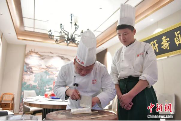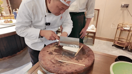 嫩豆腐在大厨精湛的刀功下如菊花般绽放