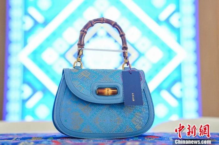 这款包是来自广西龙州龙艺织锦文化创意有限责任公司生产的文创产品,4月14日,据该公司的销售员介绍,同款包已经卖断货了,工厂正在加班生产满足订单需求。该款包上的纹样是壮锦传统的蓝色凤蝶纹,象征长寿吉祥,这是壮族民众对幸福生活的期许。